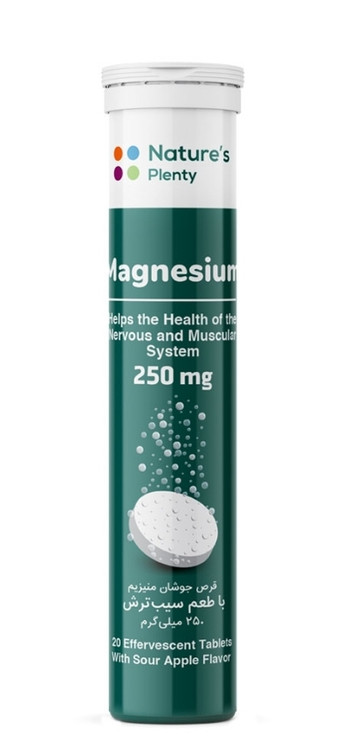 قرص جوشان منیزیم نیچرز پلنتی با داشتن 250 میلی گرم منیزیم به ازای هر قرص، در حفظ سلامت استخوان ها و بهبود عملکرد سیستم عصبی موثر است. قرص جوشان منیزیم نیچرز پلنتی با پروانه ساخت شرکت افق تدبیر سلامت در کارخانه پرارین پارس در ایران تولید شده است. این مکمل در هر قوطی حاوی 20 عدد قرص جوشان منیزیم با طعم سیب ترش می باشد.