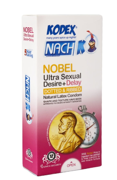 کاندوم تاخیری نوبل کدکس Kodex Nach Nobel Condom یک کاندوم تاخیری و تحریک کننده است. کاندوم نوبل کدکس حاوی لوبریکنت LA و NI است و دارای خار و حلقه برای تحریک بیشتر شریک جنسی می باشد. کاندوم نوبل مناسب برای رسیدن به ارگاسم همزمان است و دارای رایحه مطبوع می باشد