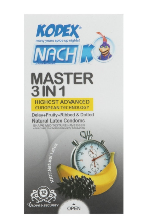 کاندوم 3 کاره ناچ کدکس مدل مستر Nach Kodex Master 3 In 1 در بسته بندی 12 عددی دارای خارها و حلقه های آناتومیک برای تحریک و افزایش لذت است. کاندوم مستر کدکس علاوه بر این مزیت حاوی ماده موثر تاخیری برای یک آمیزش طولانی و لذت بخش طراحی شده است. مزیت سوم این کاندوم رایحه میوه ای آن است که ۳ قابلیت را در یک محصول گنجانده است. کاندوم مستر 3 در 1 ناچ کدکس ساخته شده از لاتکس طبیعی توانسته کاندوم های با مقاومت بالا و ضریب اطمینان بالا تولید کند
