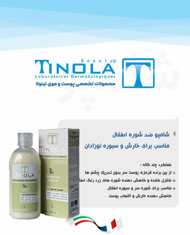 شامپو ضد شوره اطفال تینولا مناسب انواع مو که حاوی سالسیلیک اسید ، کلیمبازول ، کافئین و نیاسینامید می باشد که موجب از بین بردن قرمزی پوست سر بدون تحریک چشم ها ، کاهش خارش و التهاب پوست ، کنترل و کاهش شوره های زرد رنگ اطفال می شود
