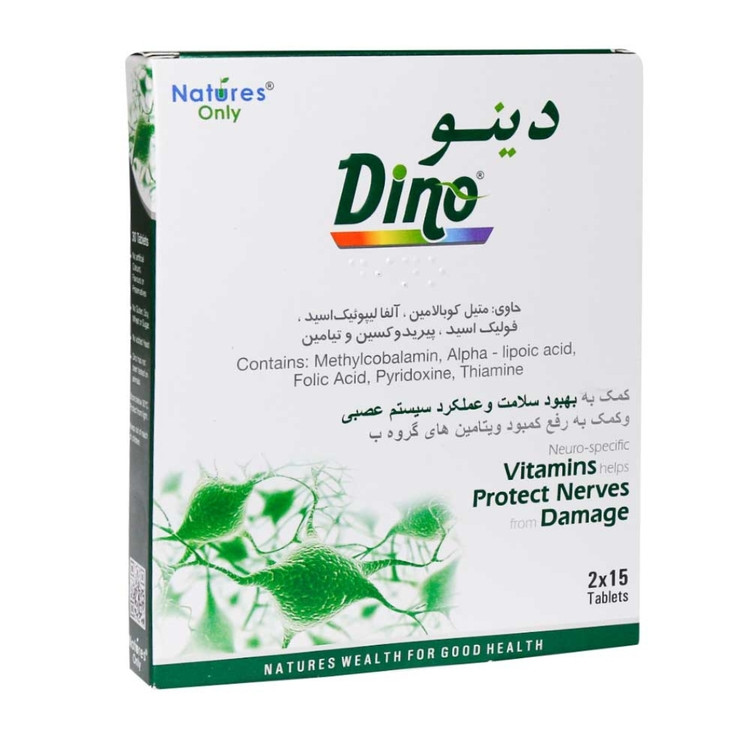 قرص دینو نیچرز اونلی یک مکمل با ترکیبات منحصر به فرد جهت حفظ سلامت دستگاه عصبی مرکزی و محیطی است. این قرص حاوی ۵ ترکیب موثر از جمله متیل کوبالامین، آلفا لیپوئیک اسید، فولیک اسید، پیریدوکسین و تیامین است. تمامی این ترکیبات در کنار هم در بهبود بیماریهای عصبی از جمله نوروپاتیهای محیطی و مرکزی، نوروپاتی دیابتی، نوروپاتی ناشی از مصرف دارو موثر است. دوز بالا و موثر ویتامین B۱۲ موجود در Natures Only Dino نشان از تاثیر آن بر سلامت کلی بدن دارد.