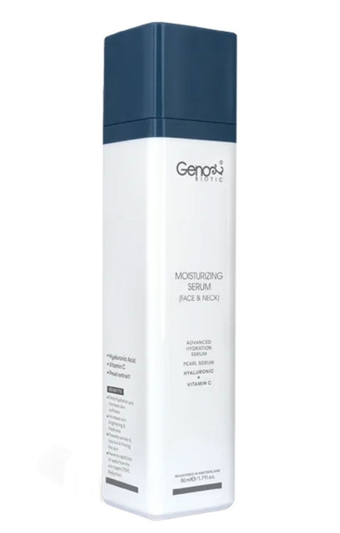 سرم رطوبت رسان صورت و گردن ژنوبایوتیک غنیترین ترکیبات مفید را به جهت رطوبت رسانی روزانه در خود دارد. یکی از مهمترین ترکیبات اصلی موجود در این سرم پوست، هیالورونیک اسید با وزن مولکول کم است که قدرت جذب بالایی داشته و علاوه بر آب رسانی قوی، موجب حفظ رطوبت پوست صورت در طول شبانه روز میشود. ویتامین سی به کار رفته در سرم پوست ژنوبایوتیک ( moisturizing serum ) موجب افزایش ترمیم بافت سلولی، رفع کدری پوست و درخشانتر شدن پوست میشود. علاوه بر آن عصاره مروارید به کار رفته در این سرم مرطوب کننده، به دلیل داشتن انواع مواد معدنی یک کمپلکس بسیار قوی برای آبرسانی و رفع مشکلات پوستی به حساب میآید و مشکلات پوستی اعم از خشکی، چروک و .. را درمان میکند.