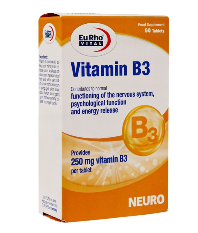 قرص ویتامین B۳ ۲۵۰ میلی گرم یوروویتال یک مکمل موثر جهت بهبود متابولیسم و افزایش انرژی بدن، تقویت سیستم عصبی و کاهش علائم افسردگی در افراد است