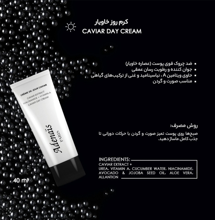 کرم روز خاویار آدنایس 40 میلی لیتر Adenais Caviar Day Cream 40ml؛ حاوی عصارهی خاویار و نیز مواد اثربخشی همچون؛ اوره، آب خیار، آلانتوئین، نیاسین آمید، روغن آووکادو، آلوئه ورا، روغن دانه جوجوبا و ویتامین آ A می باشد که دارای خواص ضد چروک و مرطوب کنندگی پوست صورت است و برای هر نوع پوستی قابل استفاده خواهد بود.