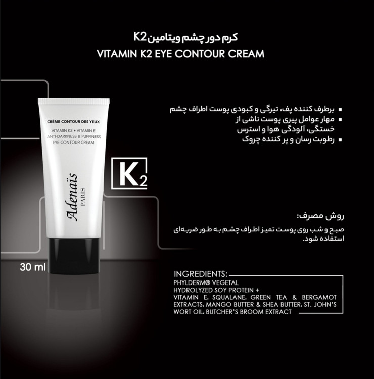 کرم دور چشم آدنایس با بهره گیری از ویتامین K2 و E ترکیبات موثر، پوست پف، تیرگی و کبودی پوست اطراف چشم را برطرف می کند. این کرم دور چشم پوست نواحی دور چشم را رطوبت رسانی کرده و چروک و خطوط پنجه کلاغی را پر می کند و از پیری پوست ناشی از خستگی آلودگی هوا و استرس جلوگیری می کند.